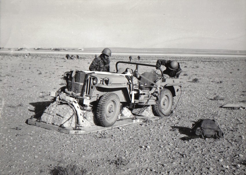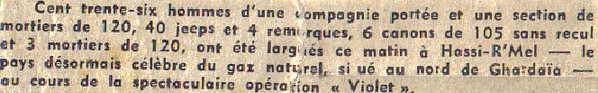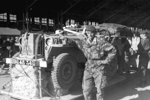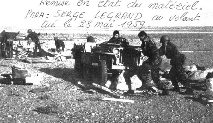 plan devant le capitaine Alain Bizard]. Le résultat fut tout aussi spectaculaire, puisqu’alors que l’on compte dans ces sortes d’opérations un déchet normal de 10%, deux jeeps seulement furent endommagées [photo d’illustration prise lors d’un en traînement sur la zone de Blida]. (extrait d’un journal de l’époque sauf parties entre [ ] : précisions apportées par André MAZIARZ)
