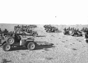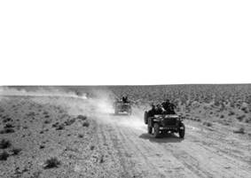 éclairées à contre jour par un clair soleil, tandis que jeeps, mortiers et